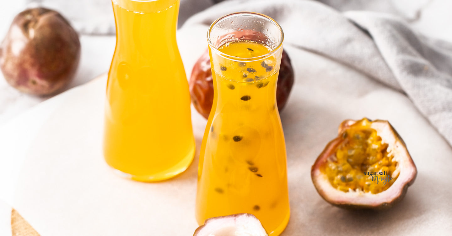 - Halve the passionfruit and place it with water in a pot over a medium heat Â