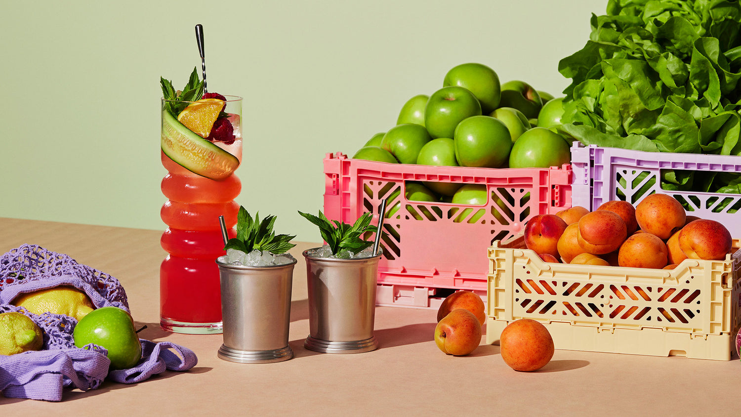 - Garnish with a crown of mint, fresh berries, cucumber ribbons, orange and apple
