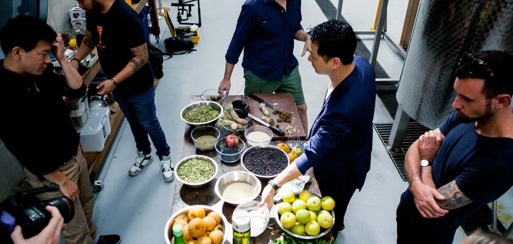 So we played with a mix of Australian botanicals, Japanese flavours and fresh fruit. The final product is a distillation of Yarra Valley nashi pear and fuji apple, bright tart yuzu from Queensland, Tasmanian Wasabi, the exceptionally fragrant strawberry gum, sesame seed, lemon myrtle, sansho pepper, ume, juniper and orris root.