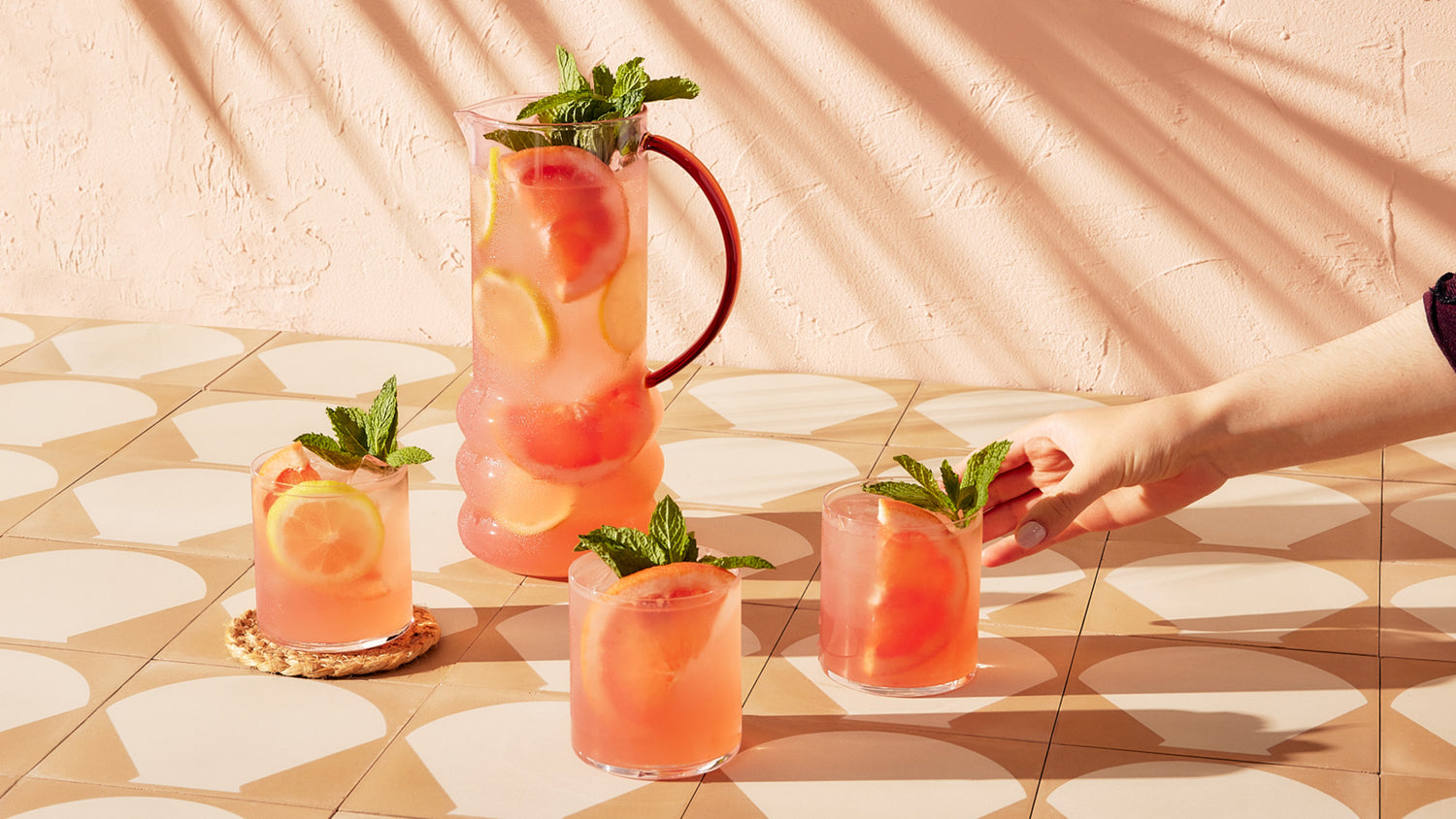 - Layer with grapefruit + lemon wheels and garnish the carafe with mint